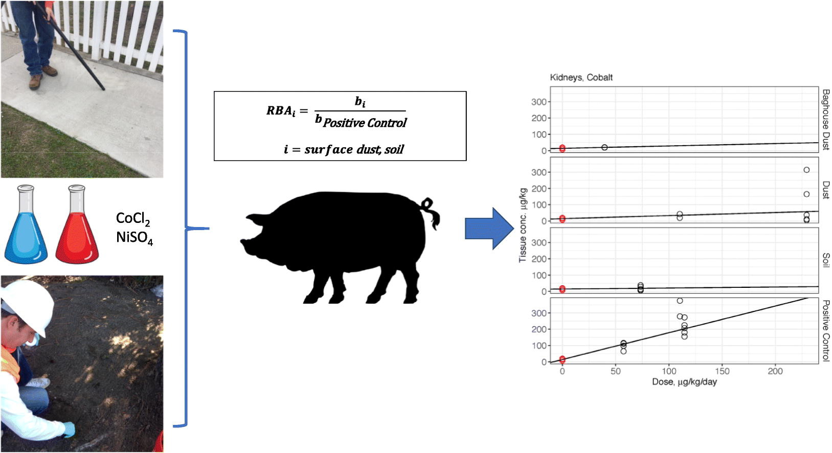 Including measures of relative bioavailability (RBA) improves the accuracy of site-specific risk assessment when evaluating metals bound in matrices that resist acid digestion (alloys, slag, tailings). In vitro gastrointestinal bioaccessibility and in vivo RBA assessments were conducted using baghouse dust, surface dust, and soil collected in a neighborhood near a metal forge, which emitted metals in the form of corrosion resistant alloys. The study objective was to characterize the in vitro bioaccessibility and relative bioavailability (RBA) of cobalt and nickel when ingested as freely soluble forms (ionic salts used as the basis for oral toxicity criteria), compared to when incidentally ingested in the forms found in the environment. Test materials and standard reference materials—cobalt chloride and nickel sulfate—were administered daily for 14 or 21 days, twice daily, to juvenile swine. Daily intake doses for cobalt were ≤229 μg/kg-day, and for nickel, ≤1419 μg/kg-day. Concentrations of cobalt and nickel were measured in various tissues; 24-hour urinary excretion of each metal was also measured. Multiple linear regression modeling was performed for tissue concentration or urinary excretion vs. dose in each material, with weighting as inverse variance in each dose group. Liver, urine, and kidney provided the optimal data. Although RBA values were affected by limited absolute bioavailability of cobalt and nickel in reference materials, trends across the different biological matrices consistently showed significantly reduced bioavailability of cobalt and nickel in soil and dust, with RBAs ranging from 0.2% to 12%. Bioaccessibility of cobalt and nickel in soil and dust were 1% to 5%, and similar results were found for baghouse dust. The data demonstrate that cobalt and nickel in soil and dust affected by alloys are resistant to bioelution and absorption. This study provides useful information for site-specific risk assessments and insights for planning future research.